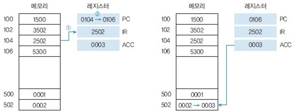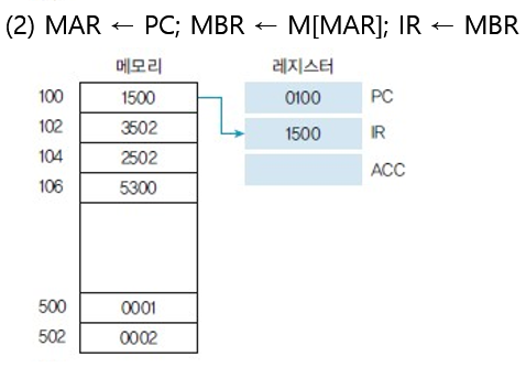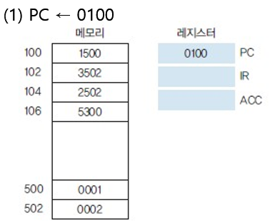 1. CPU에서 메모리 0100에 저장된 1500이라는 명령을 수행하기 위해 PC(Program Counter)에 0100이 저장된다. (CPU는 PC가 가리키는 주소에 가서 명령어를 가져온다. 명령어들의 시작 주소를 가리키도록 세팅)