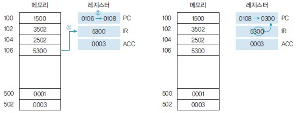 | 0106 | JMP 300 | 5300 | 0300번지 명령어로 분기 |