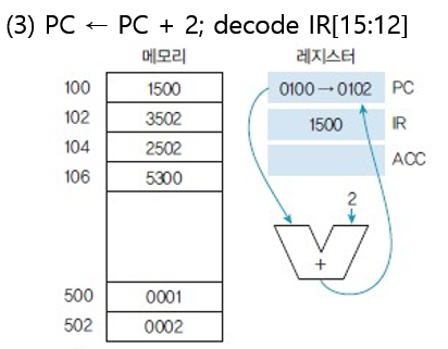 => IR에 저장된 명령어의 OpCode를 해독하고 PC가 다음 명령어를 가리키도록 한다. (0106 -> 0108)