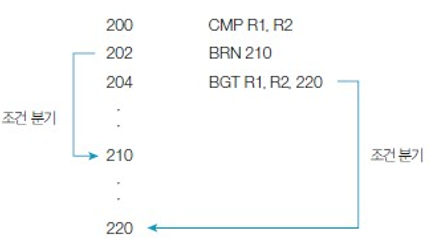 ex) R1과 R2를 비교하여 음수라면 1, 양수면 0을 반환하는 N bit를 검사하여 1이 반환됐다면 210로 분기한다.