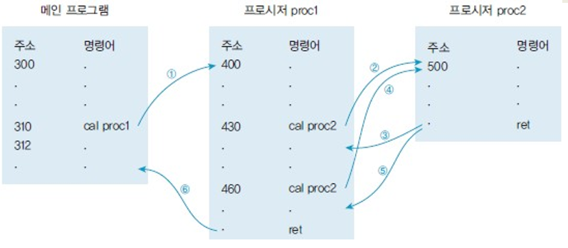 - 복귀 주소를 저장 후 PC는 proc 시작 주소를 갖기 때문에 이후부터는 프로시저 proc의 명령어를 순차적으로 인출한다.