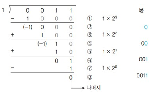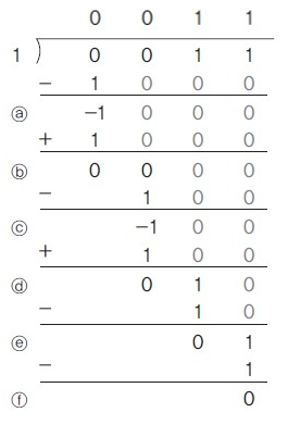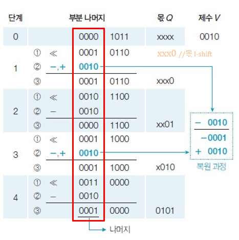 - 뺄셈 결과가 음수이면, 몫의 LSB에 0을 추가하고 제수를 다시 덧셈하여 부분 나머지를 복원한다.