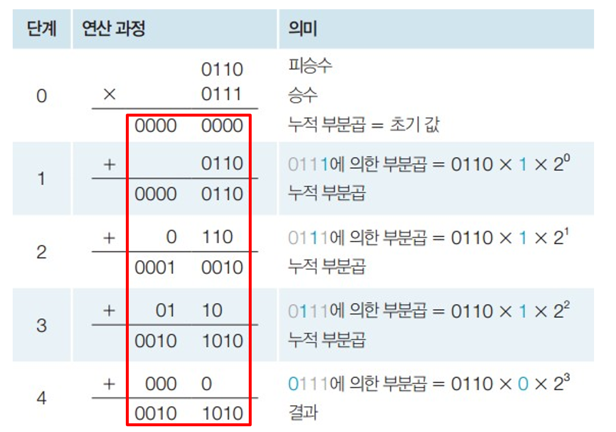 각 사이클마다 승수(부분곱)를 왼쪽으로 1-Shift하고, 누적 부분곱에 부분곱을 더한다.