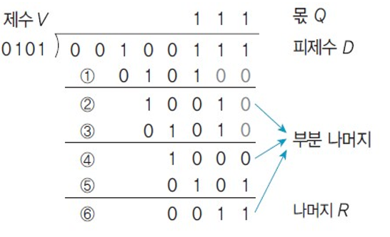 뺄셈한 결과인 부분 나머지가 음수이면, 다시 제수를 더한 다음, 더 큰 수에서 빼기 위해 피제수를 1비트씩 왼쪽으로 시프트하면서 제수를 빼는 과정을 반복하므로써 몫과 나머지를 구한다.