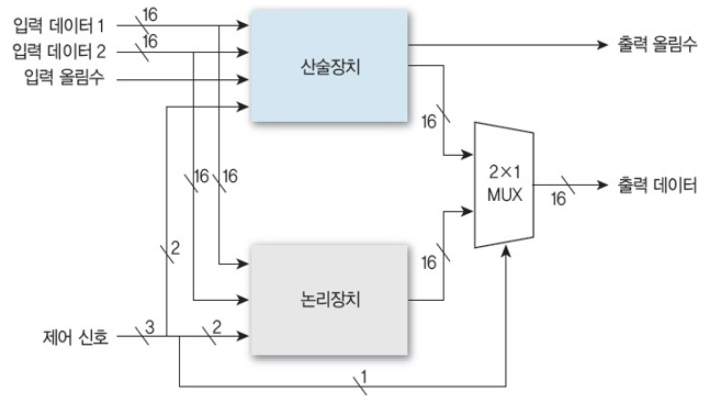 - 1bit는 멀티플렉서에 적용되어 산술장치와 논리장치 출력 중 하나를 선택하여 출력한다.