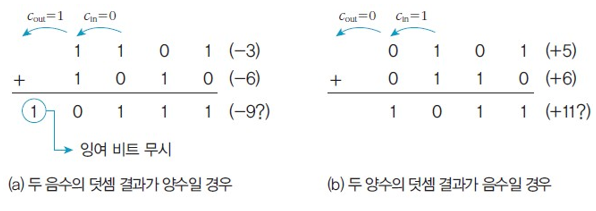 두 수의 부호가 같을 때: 자리올림수(잉여 비트)를 무시한 결과는 오버플로우가 발생가능하다.