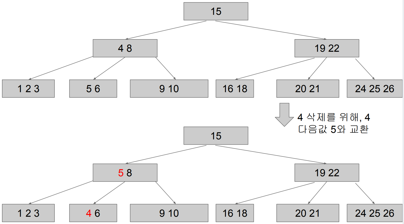 - 4가 있는 노드는 리프 노드가 아니므로 4를 삭제하기 위해 바로 다음 값인 5가 저장된 리프 노드를 찾고 5와 위치를 변경한다