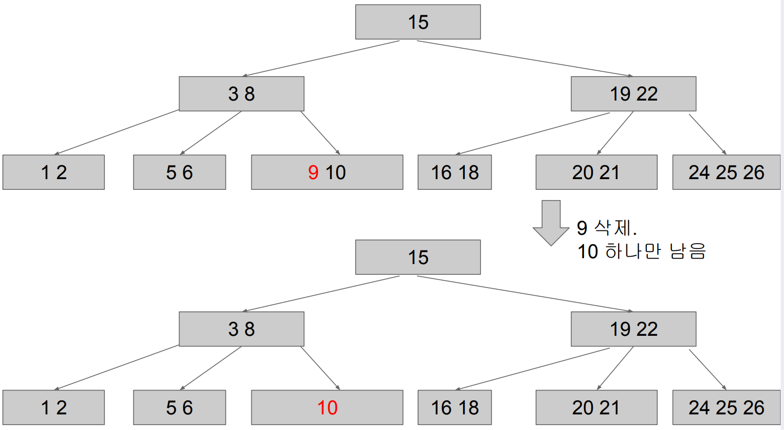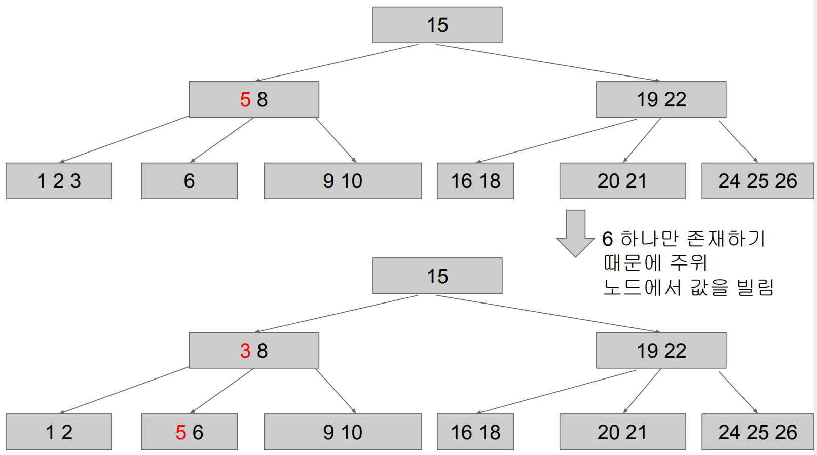 - 각 노드는 최소 2개 이상의 키 값을 가져야 하므로 형제 노드에서 값을 하나 빌려야 한다.