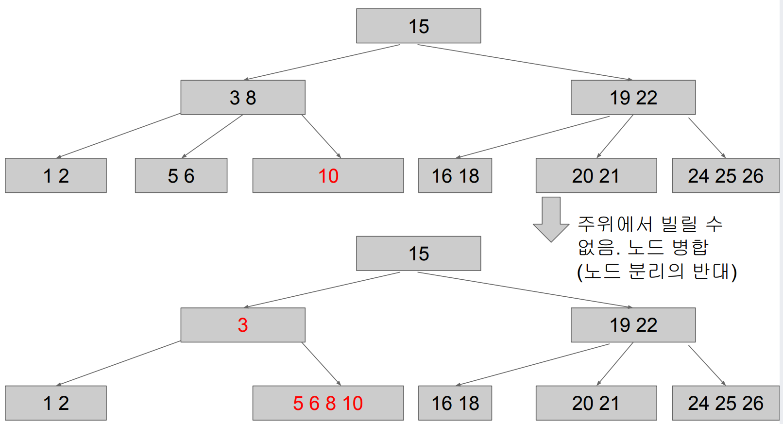 - 각 노드는 최소 2개 이상의 키 값을 가져야 하므로 형제 노드에서 값을 하나 빌린다.