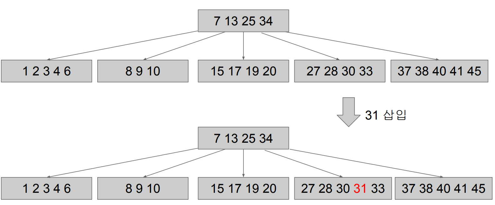 - 31의 범위에 해당하는 노드안의 키 개수가 4개이므로 1개 더 삽입할 수 있다.