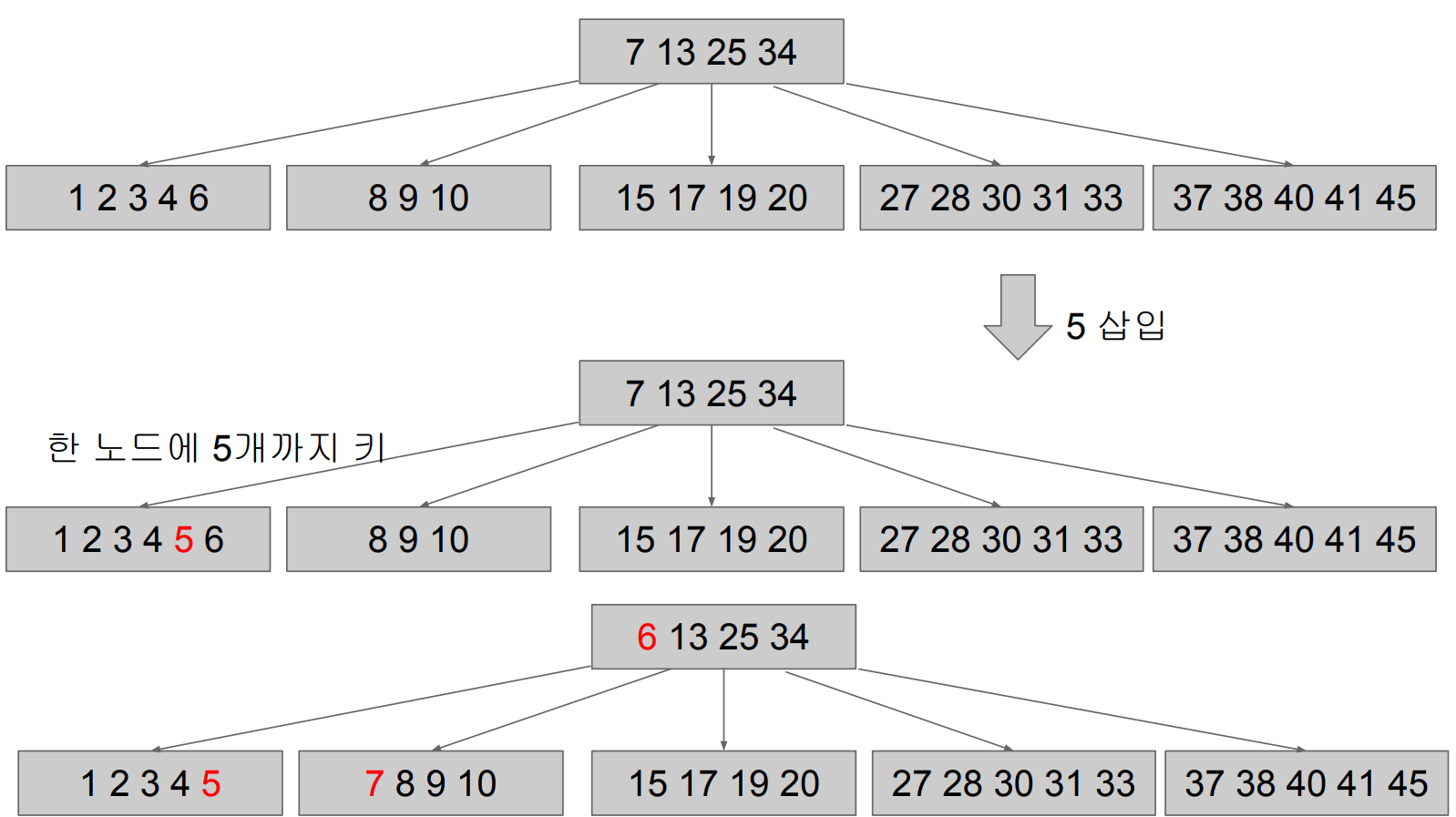 - 5의 범위에 해당하는 노드안의 키 개수가 5개이므로 1개 더 삽입할 수 없다.