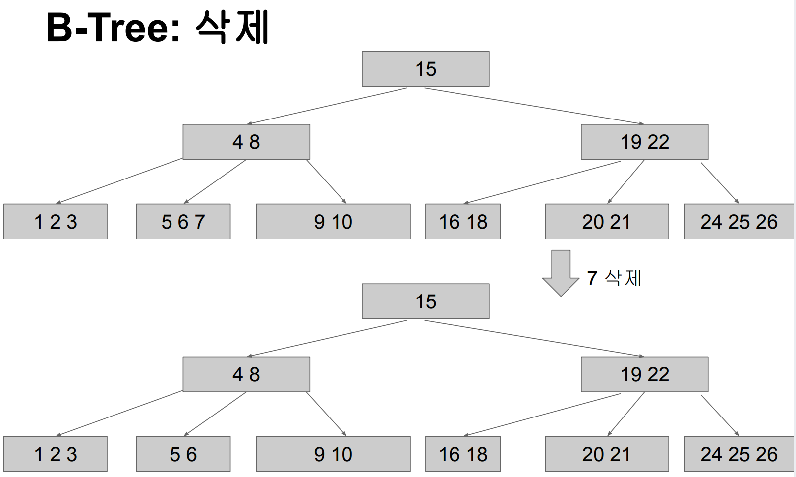 - 7이 해당한 노드가 리프 노드이고, 3개의 키 값을 갖고 있으므로 그냥 삭제해도 문제가 생기지 않는다.