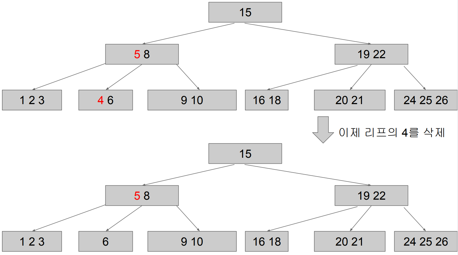 - 삭제할 노드와 형제 노드 1개를 2개 이상의 키 값을 갖는 노드 하나로 병합한다.