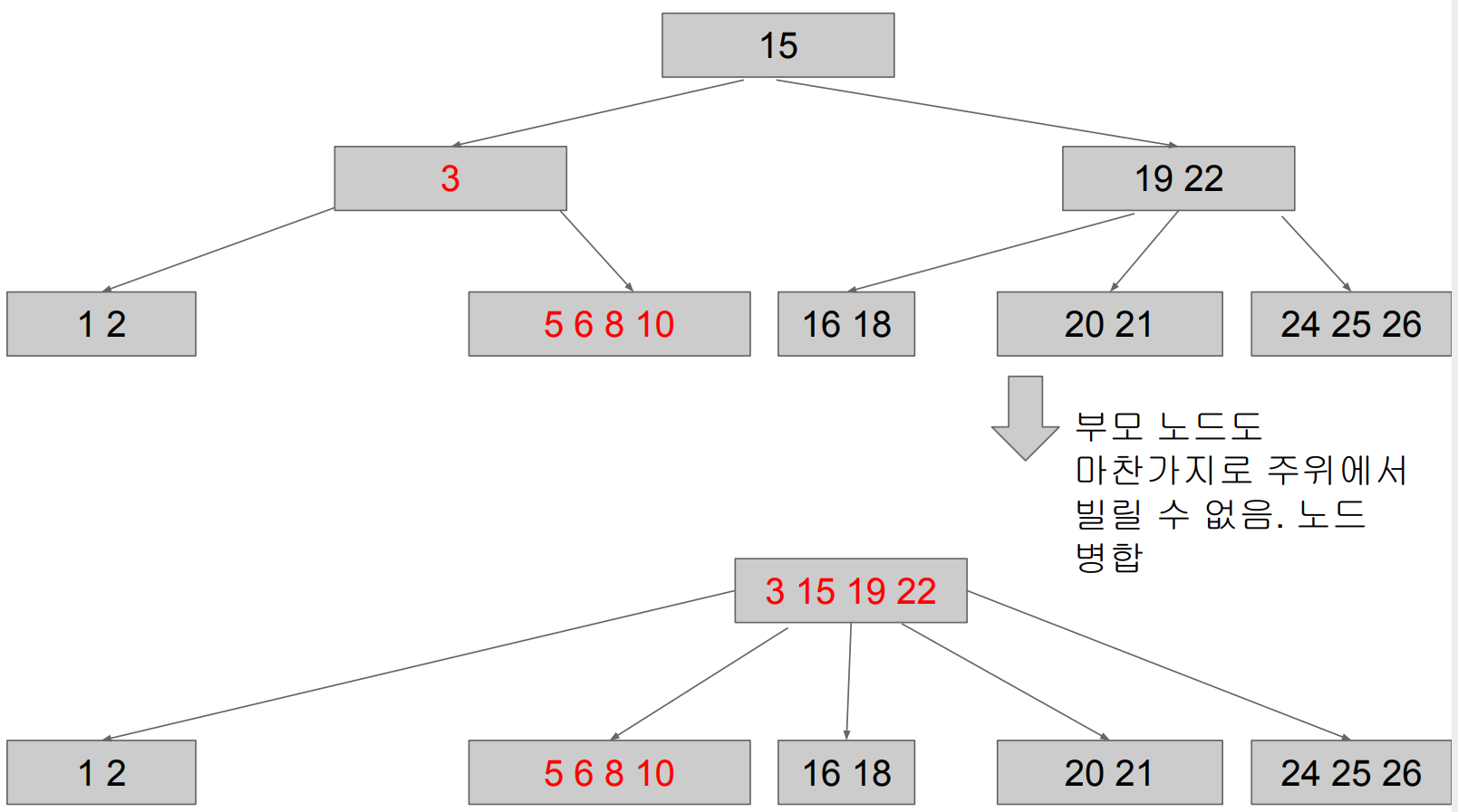 - 그러나 이 과정에서 B - Tree의 조건을 만족하기 위해 부모 노드에 있는 키 값 한 개가 병합되어야 하고, 부모 노드의 키 값이 2개 미만이 된다.