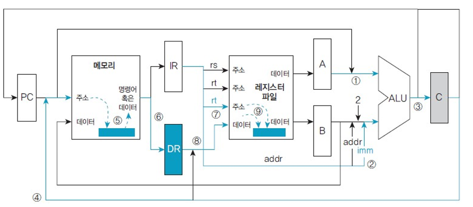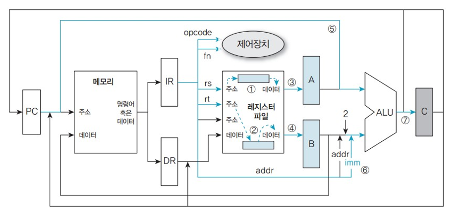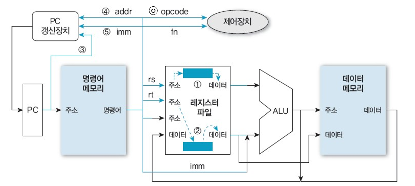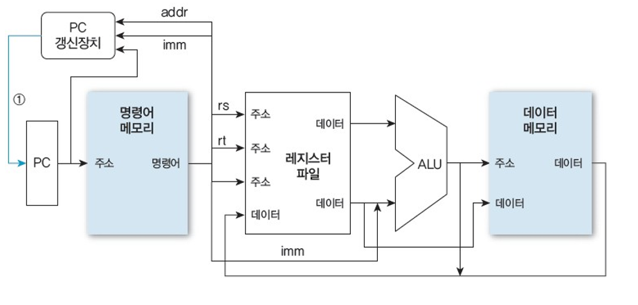 - 데이터 경로: 메모리 -> 레지스터 파일 -> 연산장치 -> PC