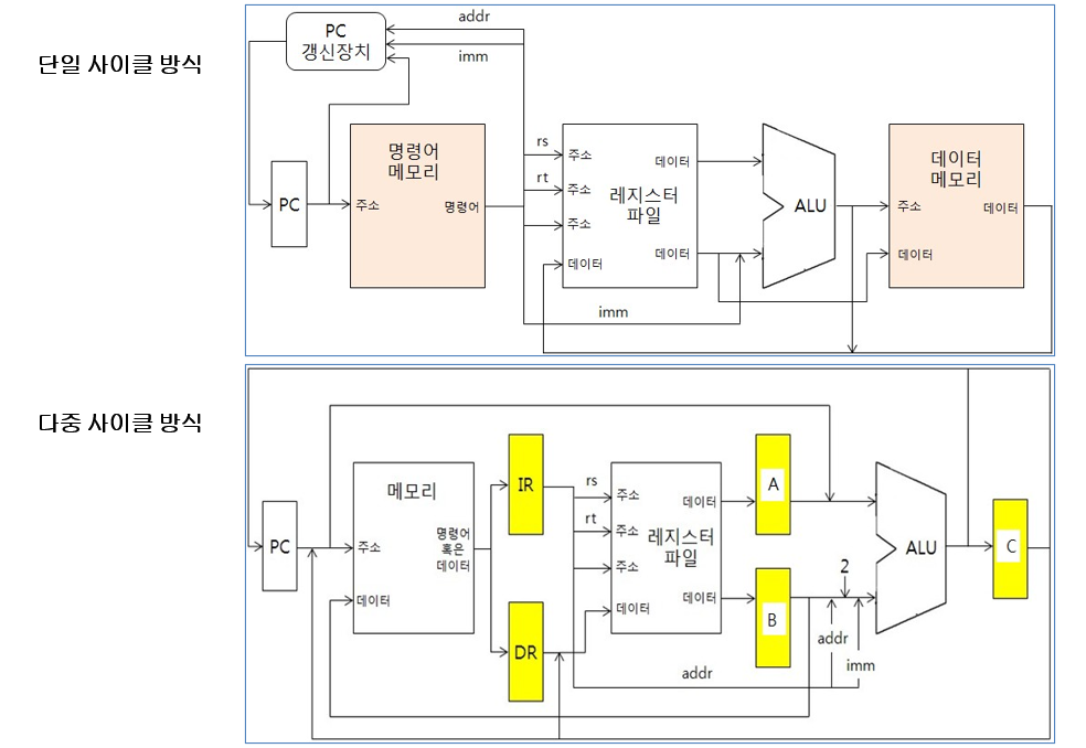 다중 사이클 방식은 명령어에 따라 다양한 개수의 사이클을 사용할 수 있다.