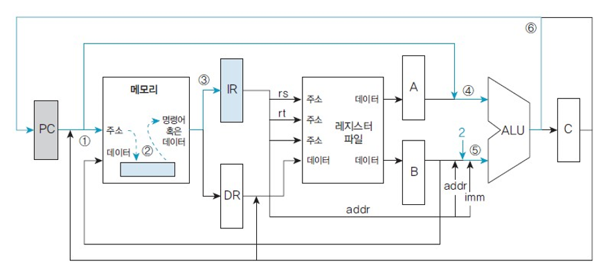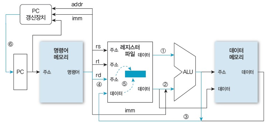 - 데이터 경로: 메모리 -> 레지스터 파일 -> 연산장치 -> 메모리