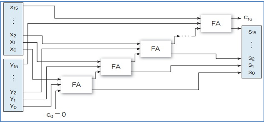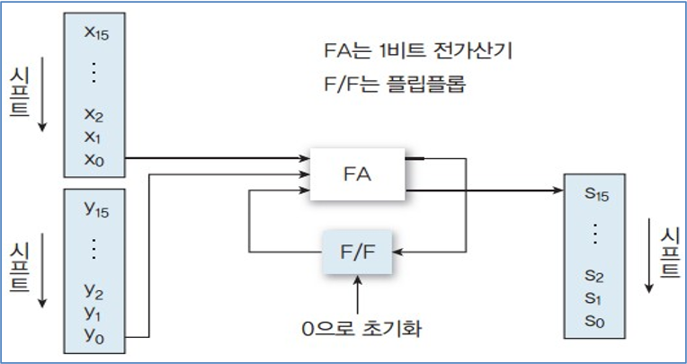 1개의 FA(전가산기)를 16번 반복 사용하여 1비트씩 연산하고, 그 결과를 차례로 저장한다.