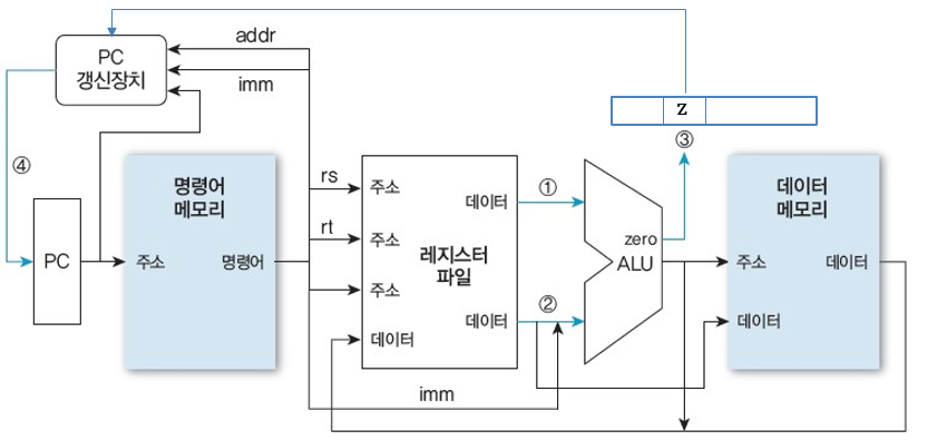 - Z 비트가 참이면, PC 갱신장치에서 계산한 분기 주소 (PC + 2 + imm × 2)로 PC를 갱신한다.