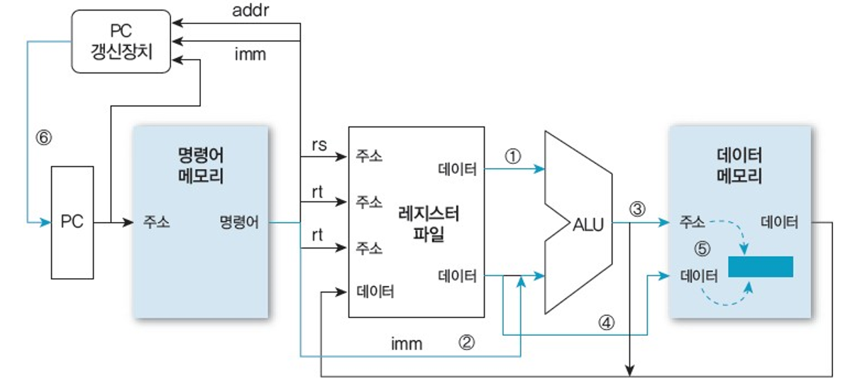 - 데이터 경로: 메모리 -> 레지스터 파일 -> 연산장치 -> 메모리