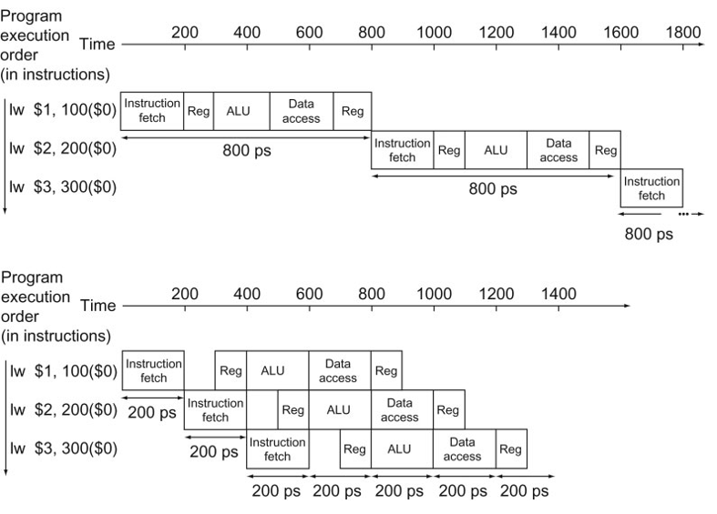 => 명령어의 데이터 경로를 세분화하고, 각기 다른 세부 단계를 동시에 수행하게 함으로써, 여러 명령어들을 중첩 수행 가능하게하여 성능을 향상시키는 방법이다.