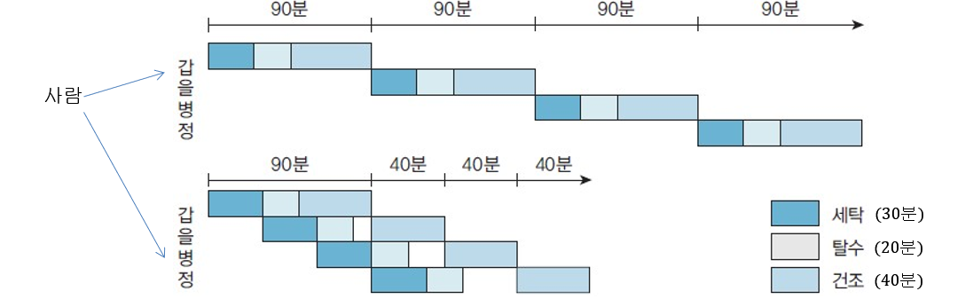 세탁 시스템을 3 -> 5단계로 분리할 경우, 즉 세탁기와 건조기를 두 대로 분할하여 15분, 20분씩 처리할 경우, 병행 방식은 순차 방식에 비해 약 2.4배 빠르다.
