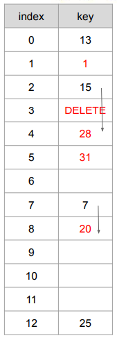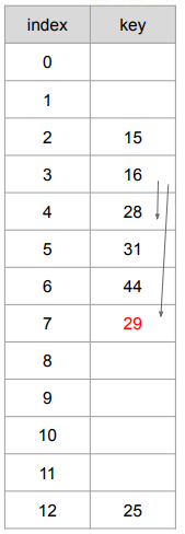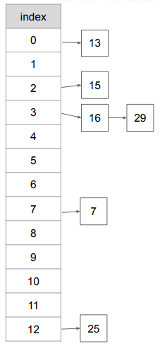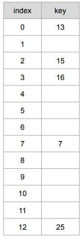 ex) {25, 13, 16, 15, 7}이 해시 테이블에 다음 값을 삽입한다. (h(x) = x mod 13)