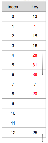ex) 다음에 저장할 원소가 38이라면, 13으로 나눈 나머지가 12로 25와 같다.