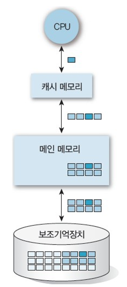 (보조기억장치의 일부-> 메인 메모리의 일부 -> 캐시 메모리의 일부 -> CPU(레지스터))