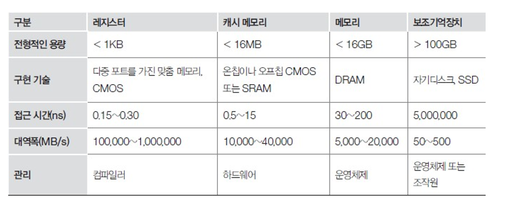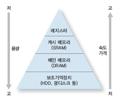 - 일반적으로 속도가 빠른 메모리는 고가이고, 느린 메모리는 저렴하다.