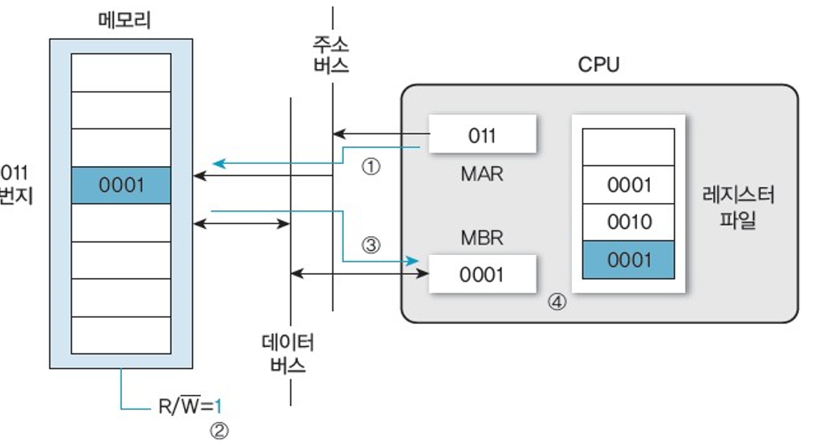 2. CPU에서 메모리를 읽기 위해 1bit R/W 제어신호 1을 전달한다.