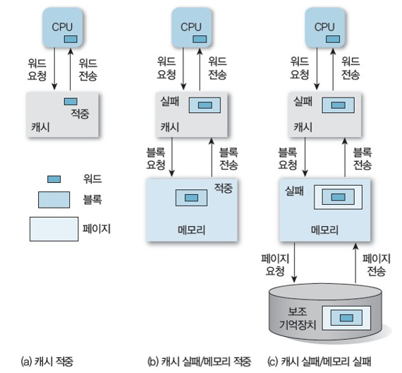 + 캐시 메모리는 속도가 우선이므로 대부분 하드웨어로 구현한다.