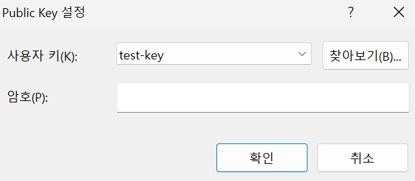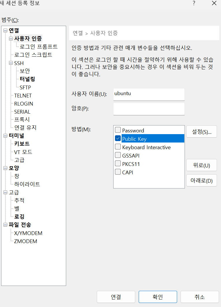 Password 선택을 해제하고, Public Key를 클릭 후, 설정 버튼을 클릭합니다.