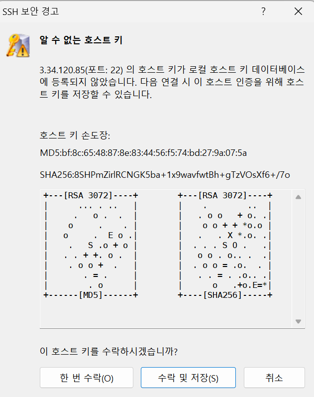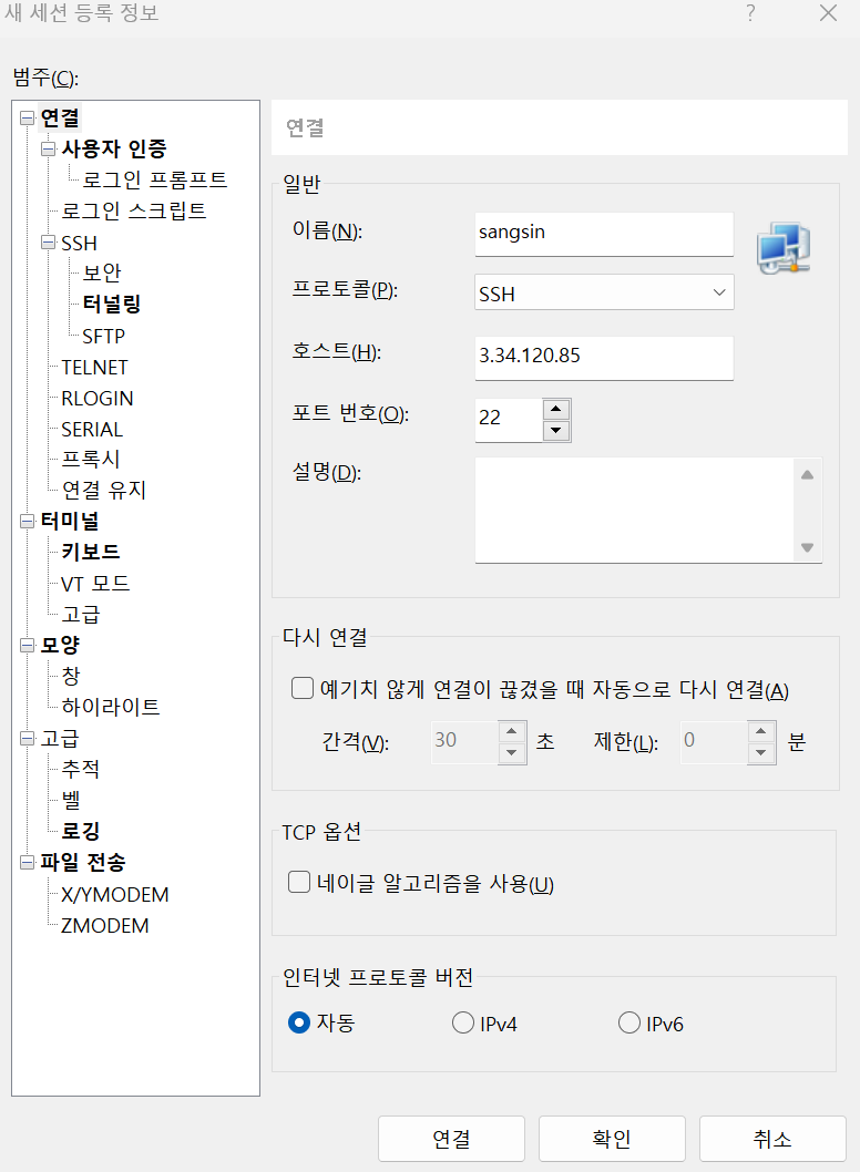 이름에는 원하는 사용자 이름을, 호스트에는 접속할 서버의 IP 주소를 작성합니다.