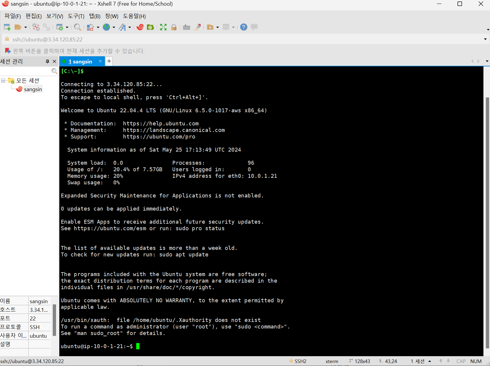 무사히 클라우드 서버에 접속한 것을 볼 수 있습니다.
