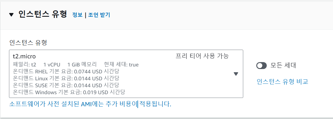 인스턴스 유형을 t2.micro으로 설정합니다. (프리티어 사용 가능)