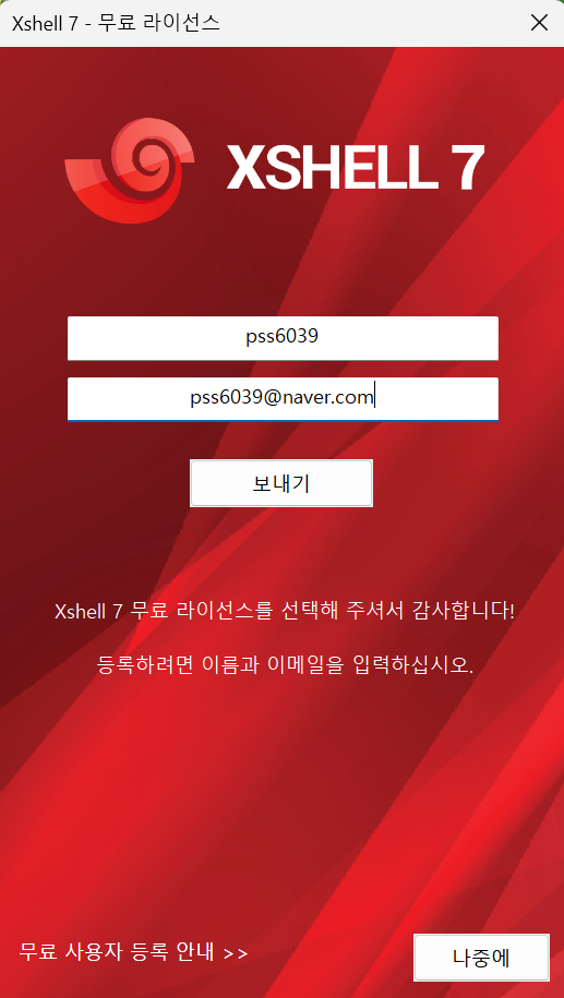 Xshell을 실행 후, 이메일을 통해 로그인합니다.
