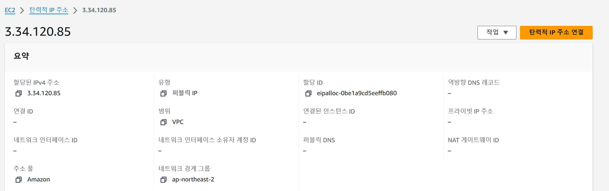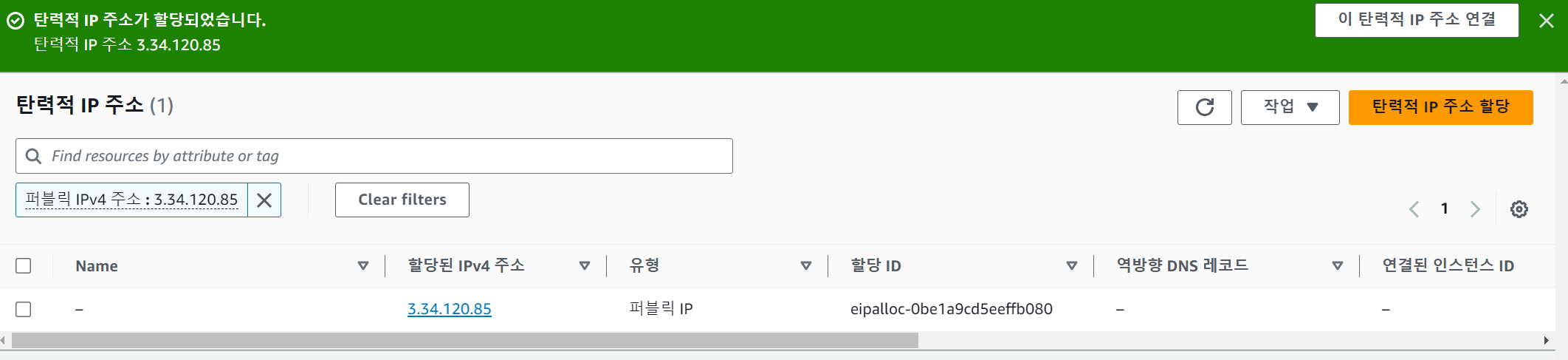 탄력적 IP 주소가 할당되었습니다.