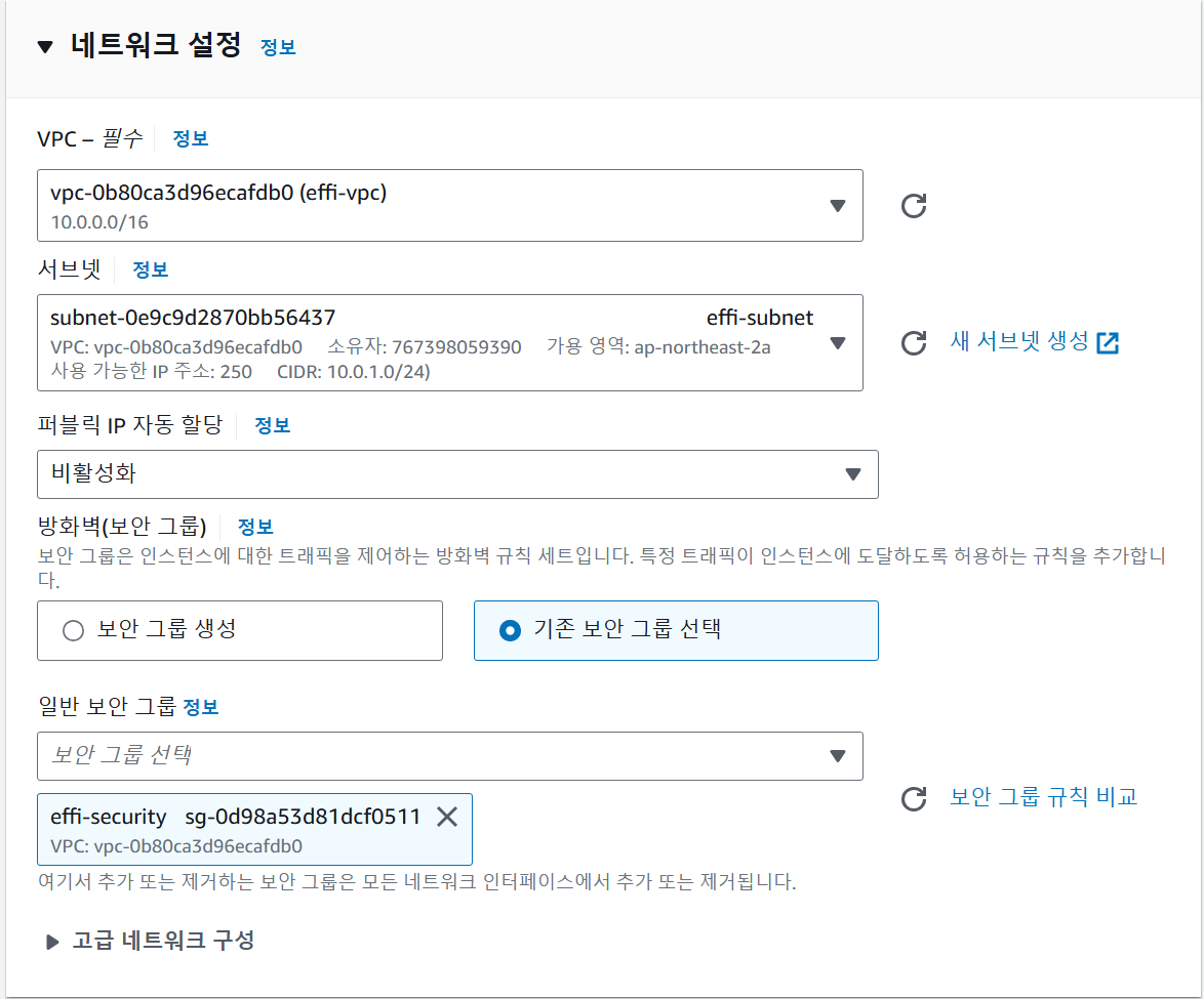 네트워크 설정 편집 버튼을 클릭 후, 이전에 생성했던 VPC, 서브넷, 보안그룹을 연결합니다.