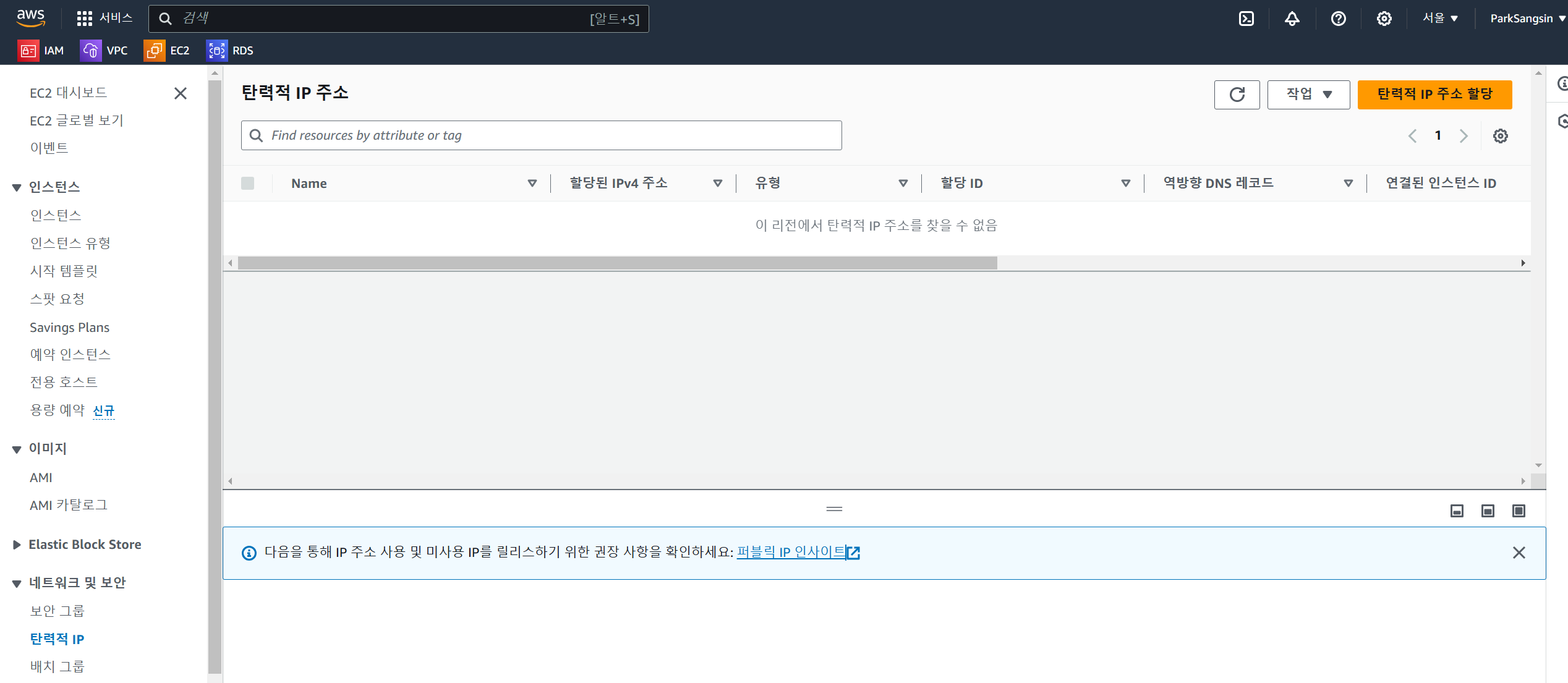 탄력적 IP 주소 할당을 클릭합니다.