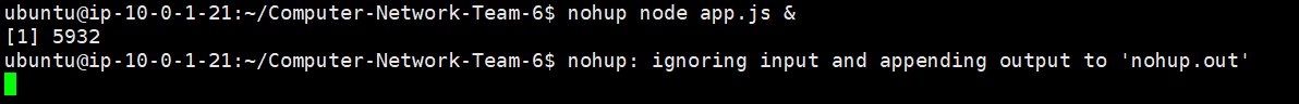 nohup node app.js & 명령을 통해 app.js파일을 실행시키고, 터미널이 종료되어도 애플리케이션이 백그라운드에서 실행되도록 합니다.