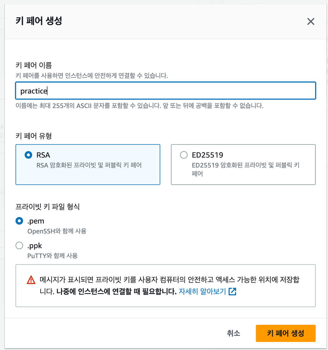 RSA와 .pem을 선택한 후, 키 페어를 생성하면 된다.
