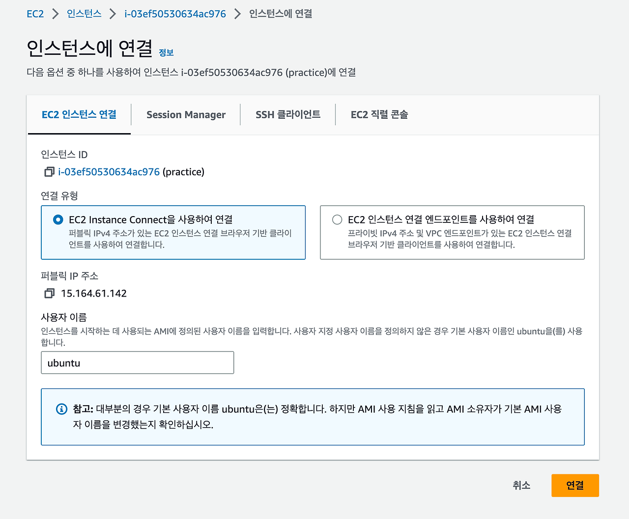 해당 인스턴스에 원격 접속할 수 있다. (우분투 환경)