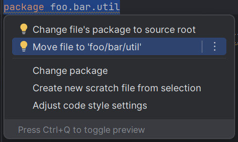 - 현재 파일의 디렉토리 구조와 코드가 일치하지 않는다면, 드래그 + alt + enter를 통해 구조를 직접 생성하고 이동시킬 수 있다.